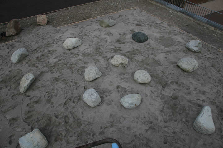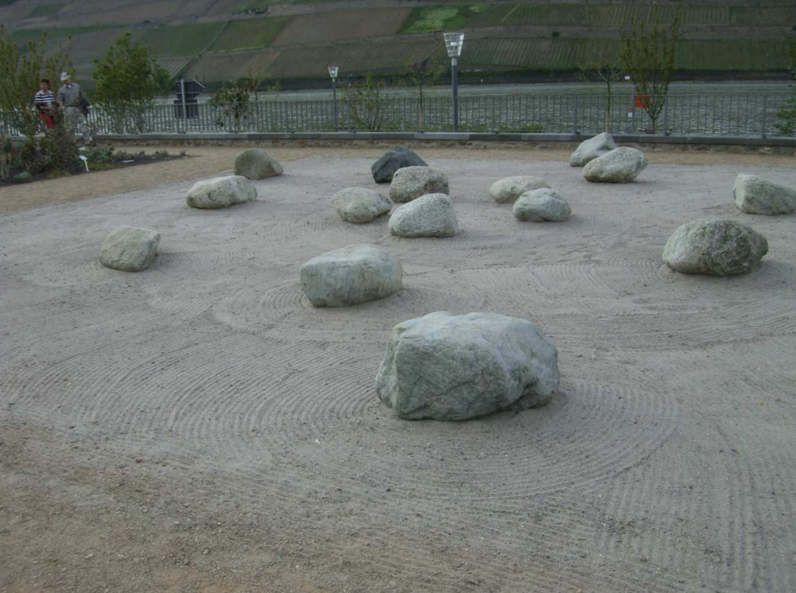 Siebzehn Rheinfindlinge symbolisieren, angeordnet zu drei Kreisen, die optische Form des Haiku. Der äußere Kreis besteht aus fünf, der mittlere aus sieben und der innerste Kreis wieder aus fünf Findlingen. Diese Steinkreise, die in Rheinsand eingebettet sind, spiegeln die drei Zeilen der Haiku-Dichtung wieder.